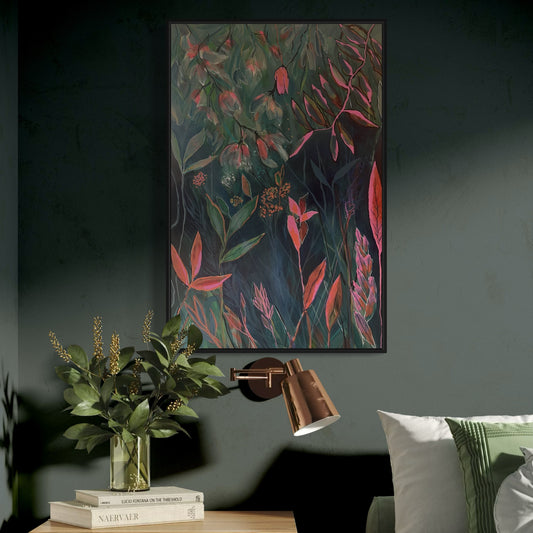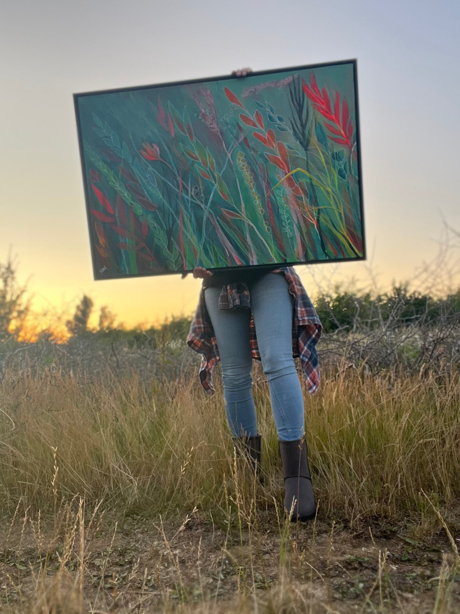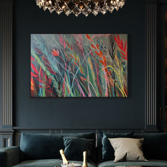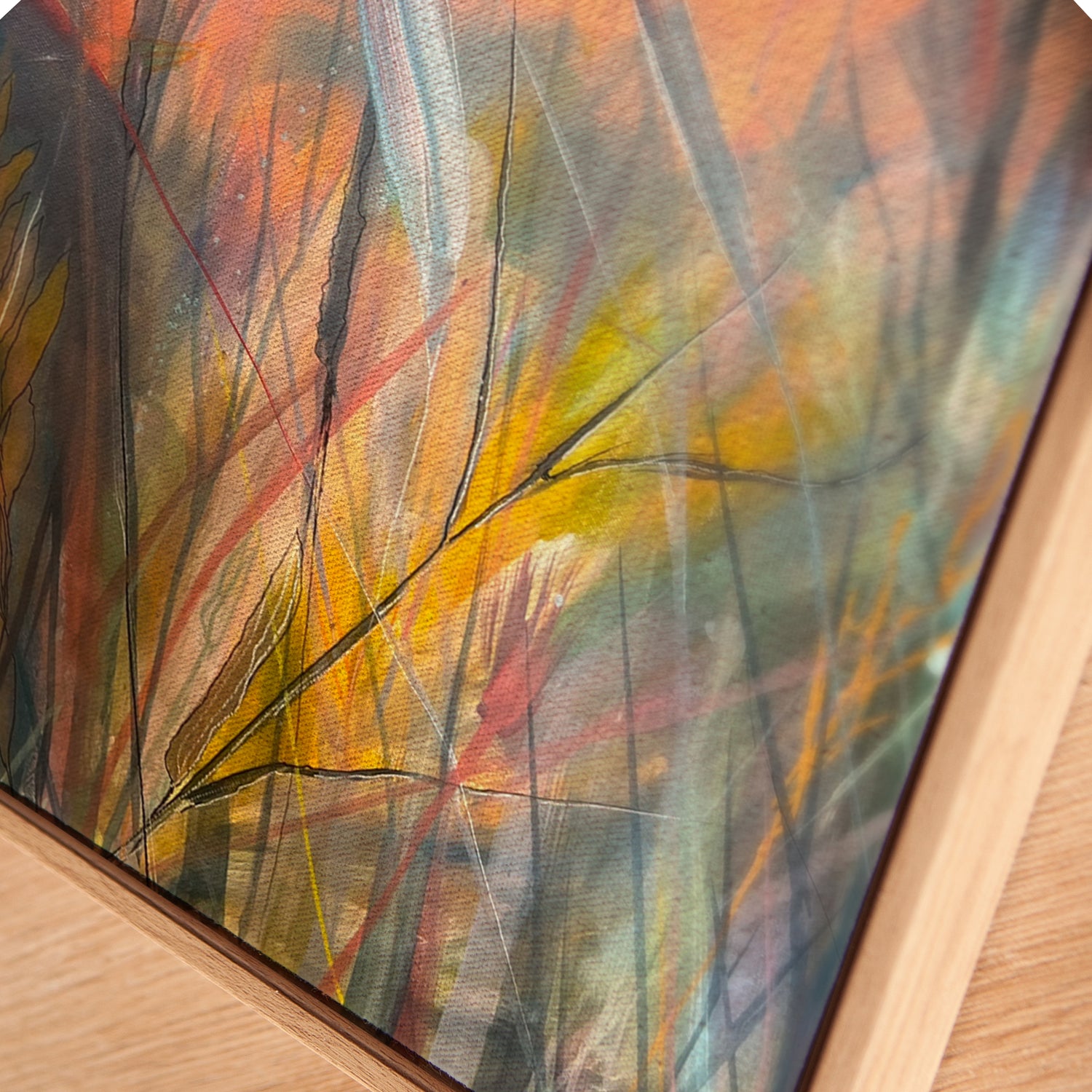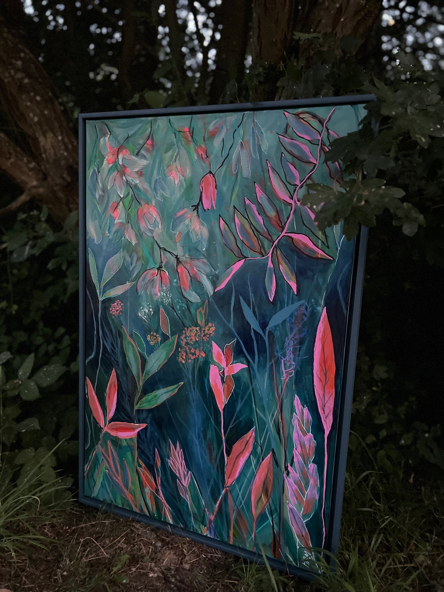 “Echo” is a vibrant acrylic work that captures the living pulse of the wild. Swathes of crimson, gold, and teal move like wind through tall grasses, tangled and free. Layered, translucent leaves and fine drawn lines reveal the rhythm beneath the surface - the murmured repetition of life renewing itself.