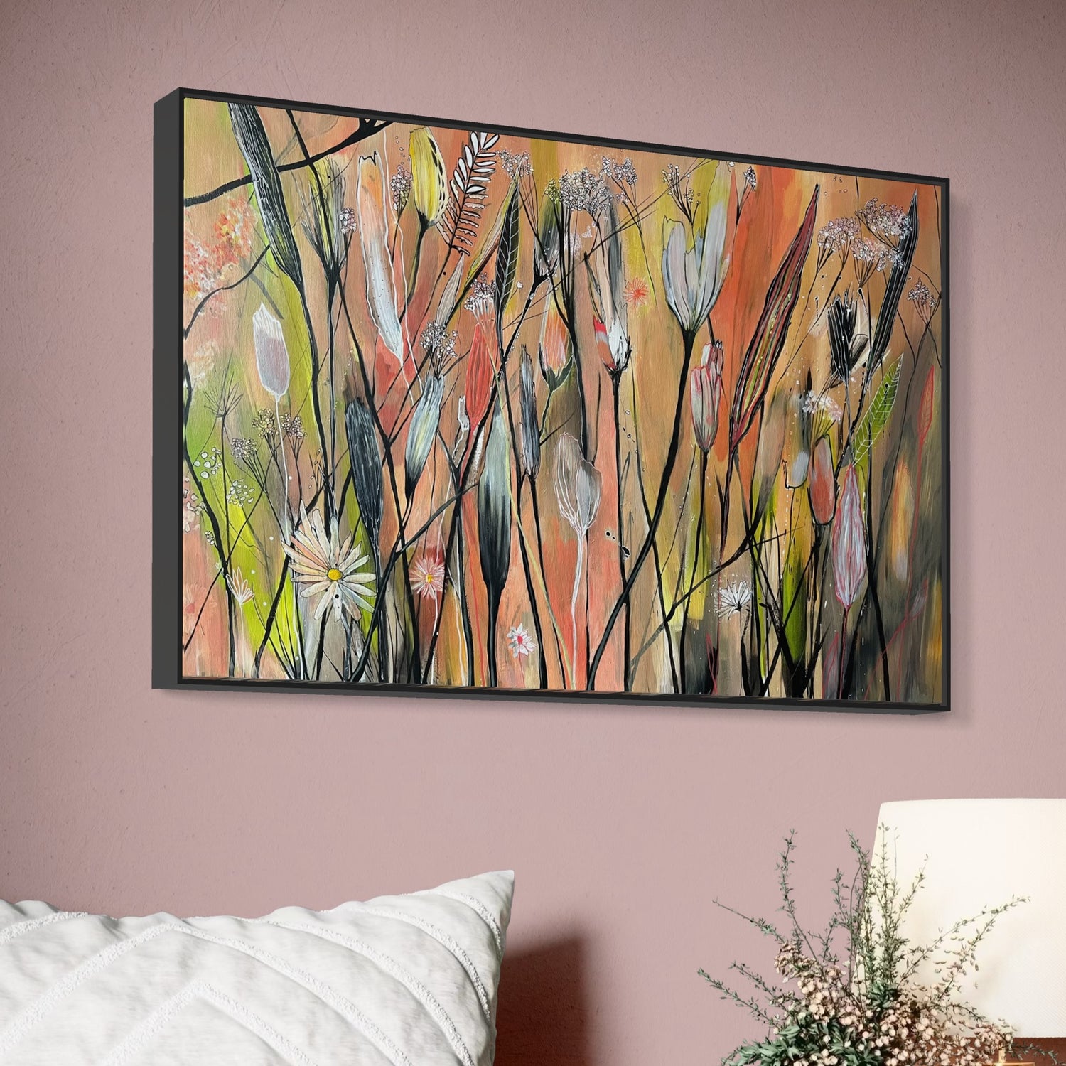 Autumn Flowers serves as the inaugural piece in the Wildflowers Collection , embodying a raw, expressive exploration of botanical forms through swift, gestural strokes. With a palette steeped in the muted hues of autumn, this abstract work exudes an organic spontaneity. Like many foundational pieces, it carries the initial spark- a feeling, thought, or intention - that not only drives the creative process but also catalyses the evolution of an entire series and future collections.