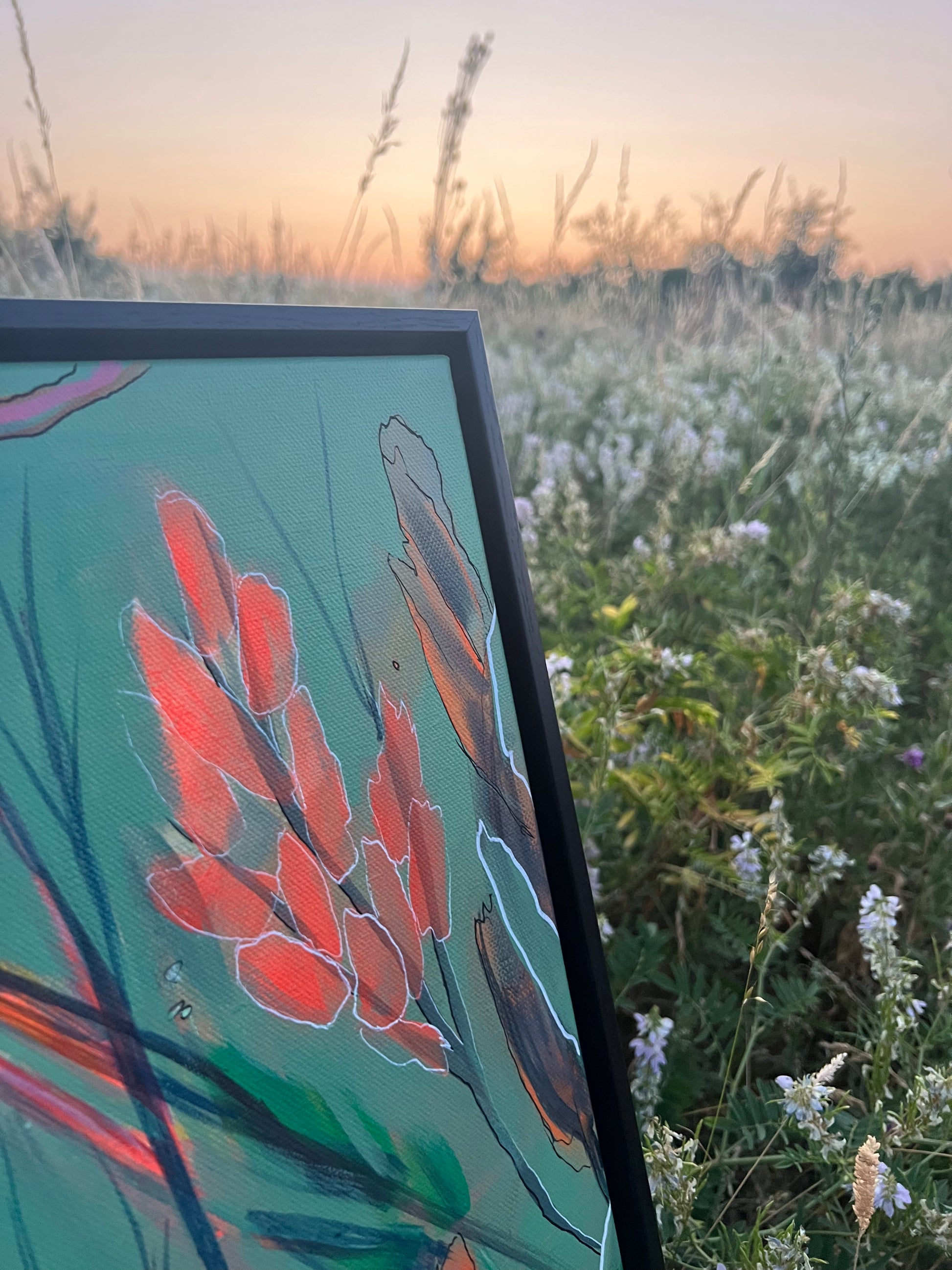 Arrive ready to hang pre-stretched and if selected framed in black or oak veneer frames. Both work exceptionally well with this painting.